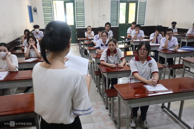 Giáo viên hướng dẫn thí sinh làm thủ tục thi tốt nghiệp THPT tại TP HCM,tháng 6/2024. Ảnh: Quỳnh Trần