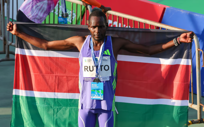 Bethwell Kipkemboi mừng chiến thắng tại Hong Kong Marathon 2025. Ảnh: SCMP