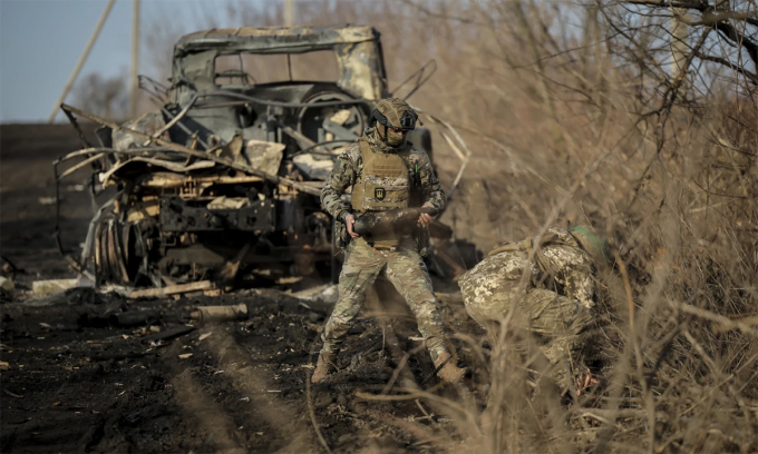 Binh sĩ Ukraine vác đạn pháo gần thành phố Chasov Yar,tỉnh Donetsk,ngày 10/1. Ảnh: AP