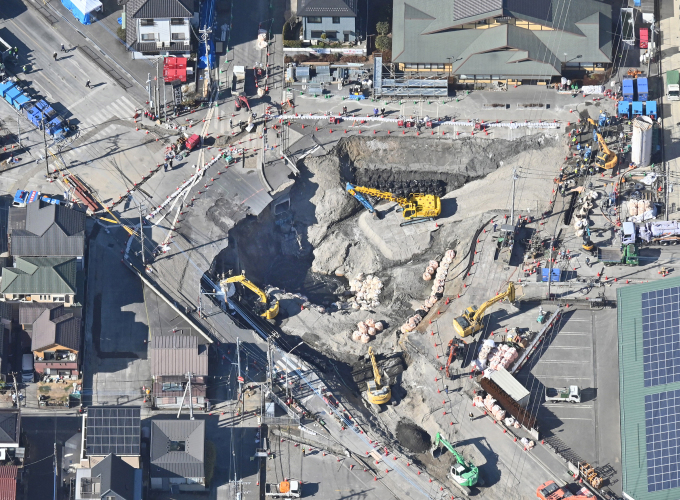 Các thiết bị làm việc tại hiện trường hố tử thần ở thành phố Yashio,tỉnh Saitama,Nhật Bản ngày 11/2. Ảnh: AFP