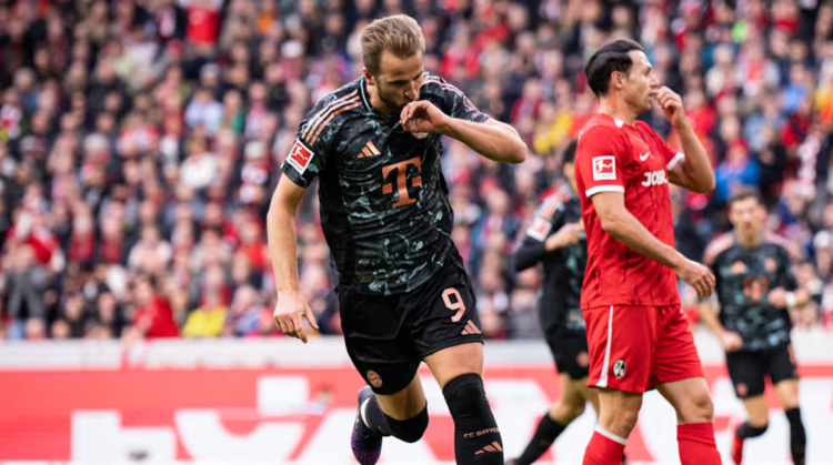 Harry Kane chia vui cùng Kim Min-jae sau khi ghi bàn thứ hai trong trận thắng Holstein Kiel 4-3 tại Allianz Arena,Munich,Đức ngày 1/2. Ảnh: Bayern FC