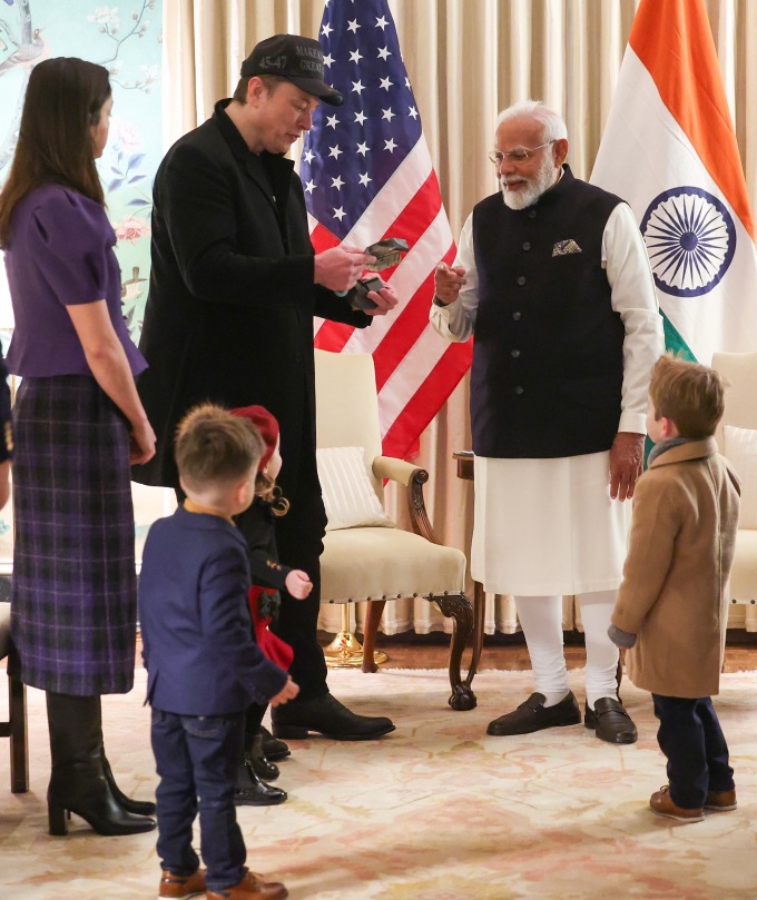 Elon Musk cùng bạn gái Shivon Zilis và ba người con gồm cặp song sinh Azure và Strider cùng cậu bé X gặp Thủ tướng Ấn Độ Narendra Modi tại Washington ngày 13/2 tại Nhà khách Blair,nơi dành cho thượng khách của Tổng thống Mỹ đến thăm Washington.