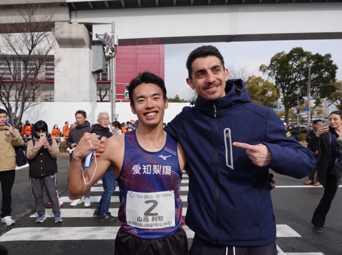 Toshikazu Yamanishi (trái) mừng chiến thắng và kỷ lục thế giới cùng nhà vô địch Olympic Tokyo 2020 Massimo Stano. Ảnh: JAAF