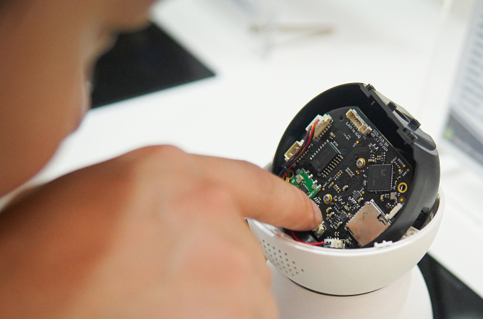 Một người đang xem mẫu camera sử dụng chip nguồn do doanh nghiệp Việt phát triển,tháng 10/2024. Ảnh: Lưu Quý