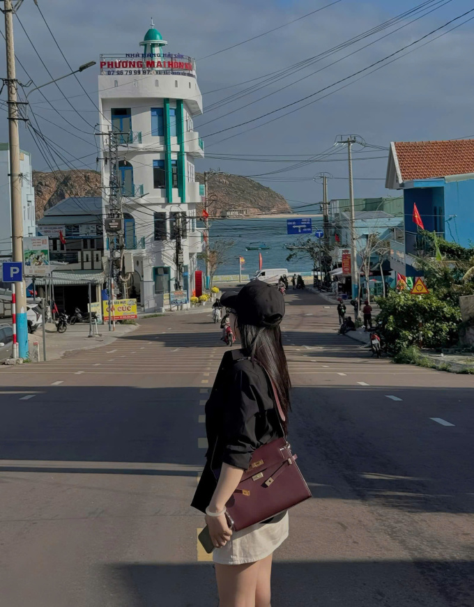 Khách check in tại con đường dốc xã Nhơn Hải. Ảnh: Yên Chi