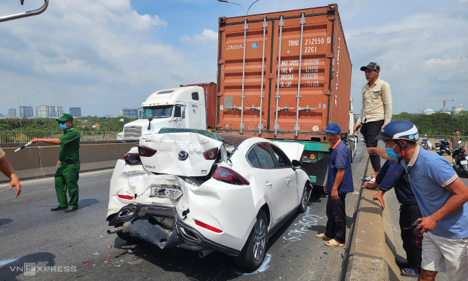 Khoảng 11h30,tài xế Nguyễn Văn Bính,38 tuổi,lái xe đầu kéo thùng hàng 40 feet chở hàng điện tử chạy trên Phú Mỹ,hướng từ quận 7 về TP Thủ Đức. Khi đổ dốc cầu,xe bất ngờ xảy ra va chạm với ôtô 4 chỗ. Xe này cũng lao tới va chạm với hai xe chạy phía trước tạo thành chuỗi tai nạn liên hoàn.