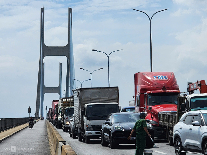 Cầu Phú Mỹ ùn tắc kéo dài sau tai nạn. Ảnh: Đình Văn