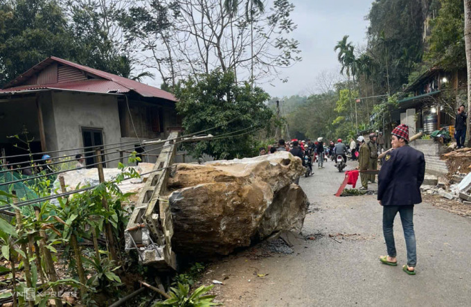 Tại vườn nhà ông Hanh,những tảng đá lớn nằm ngổn ngang,trong đó 2-3 phiến lớn nặng hàng chục tấn nằm sát mép đường liên xã. Một tảng đá đường kính lớn nhất sau khi lăn qua nhà sàn đã làm gãy cột điện.
