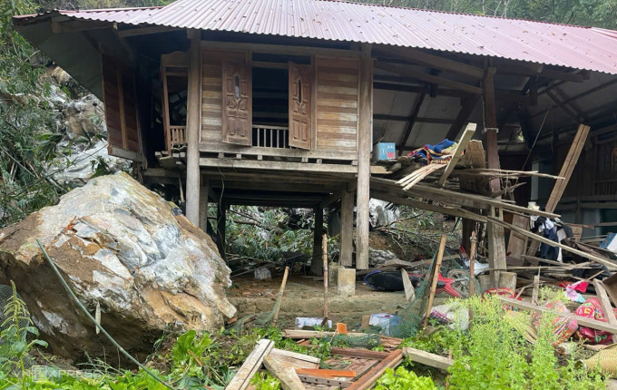 Căn nhà sàn của gia đình ông Hanh nghiêng ngả,sập một nửa bên phải và khu bếp. Ảnh: Lam Sơn