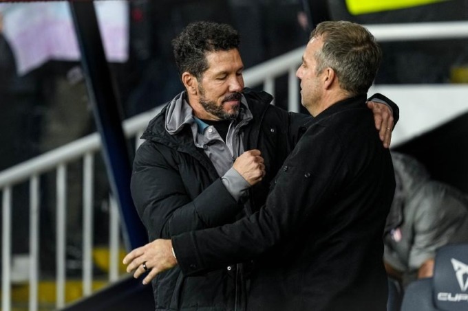 Simeone (trái) tiếp tục bất bại trước Flick khi giúp Atletico hòa Barca 4-4 ở bán kết lượt đi Cup Nhà vua tối 25/2. Ảnh: EFE