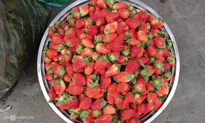 Dâu tây Trung Quốc được đổ ra thau bán tại chợ Xóm Mới,quận Gò Vấp (TP HCM). Ảnh: Thi Hà