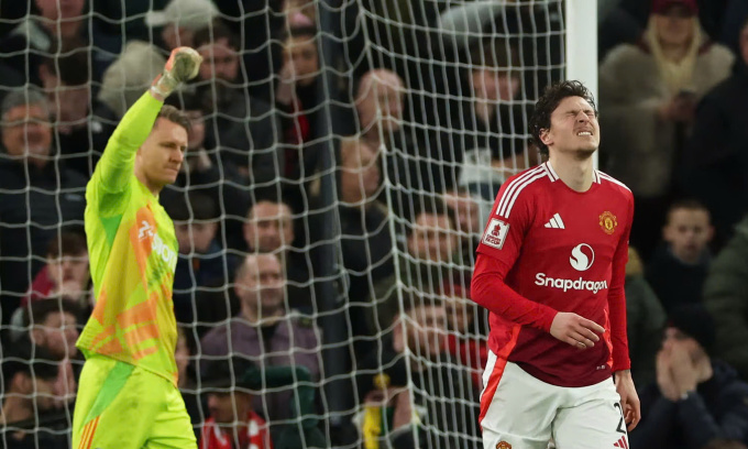 Victor Lindelof tiếc nuối sau khi bị thủ môn Bernd Leno đẩy cú sút luân lưu trong trận Man Utd gặp Fulham trên sân Old Trafford,thành phố Manchester,Vương quốc Anh,tối 2/3/2025. Ảnh: Reuters
