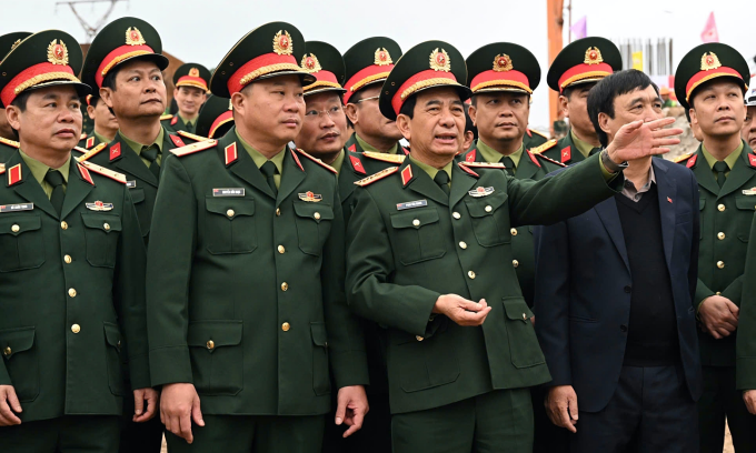 Bộ trưởng Quốc phòng Phan Văn Giang kiểm tra tiến độ xây dựng cầu Phong Châu sáng 6/3. Ảnh: Hoàng Phong