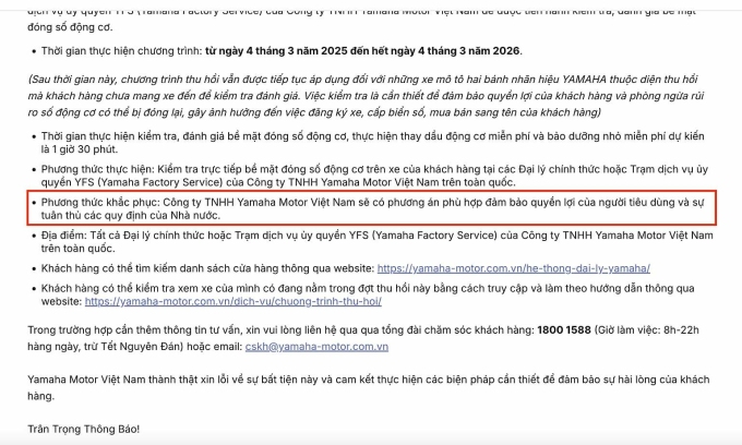 Trong hôm nay,điều khoản về phương thức khắc phục trên website của Yamaha Việt Nam đã được thay đổi. Cụ thể,phương thức khắc phục sự cố hiện tại đã được đổi lại thành "sẽ có phương án phù hợp đảm bảo quyền lợi của người tiêu dùng và sự tuân thủ các quy định của Nhà nước".