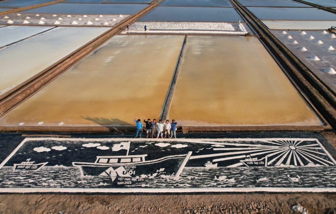 Bức tranh với thông điệp "vươn khơi đón ánh bình minh" nhằm chào mừng Festival nghề muối Việt Nam - Bạc Liêu năm 2025. Tác phẩm dài 25 m,rộng 5 m,làm từ khoảng 300 kg muối trắng,tạo hình trên một tấm bạt.