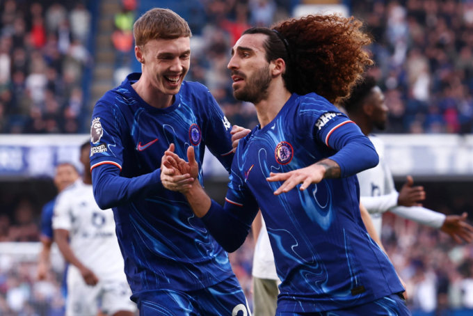 Cole Palmer (trái) mừng bàn cùng Marc Cucurella. Ảnh: Imago