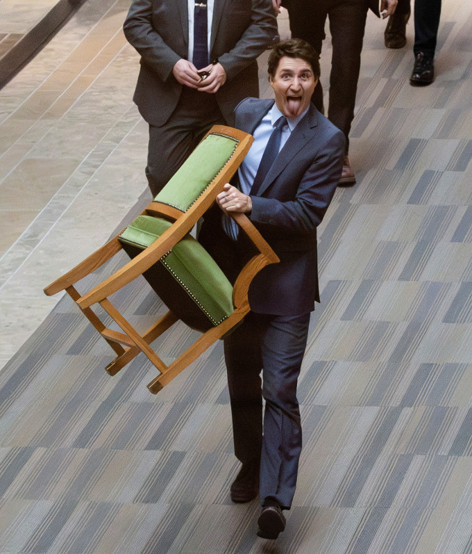 Phóng viên ảnh của Reuters chụp được cảnh ông Trudeau mang chiếc ghế của mình ra khỏi hội trường quốc hội Canada sau buổi họp cùng ông Carney,dường như tượng trưng cho sự kết thúc của một thập kỷ ông dẫn dắt chính phủ.