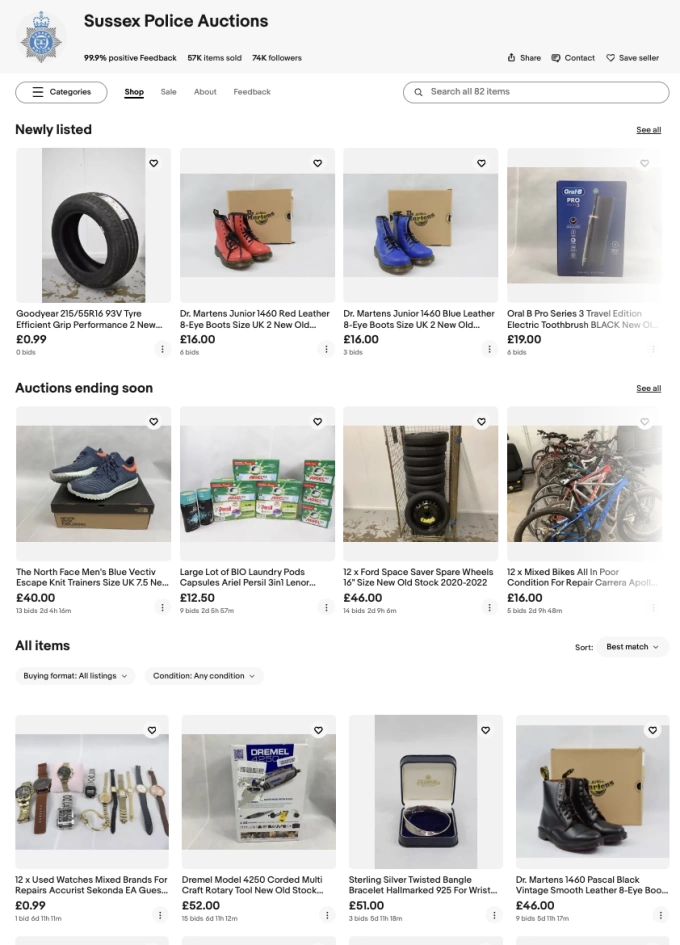 Ví dụ,Cảnh sát Sussex họ tự điều hành cửa hàng eBay riêng để bán các tài sản vô chủ hoặc hàng hóa bị tịch thu theo lệnh của tòa án. Cửa hàng cung cấp nhiều mặt hàng từ quần áo,nước hoa đến xe đạp và đồ điện tử. Tất cả có giá phải chăng.