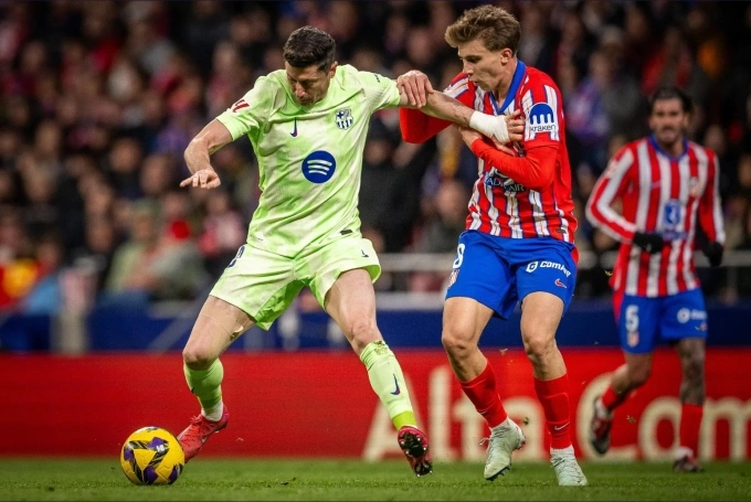 Lewandowski (trái) chơi trận Barca thắng Atletico 4-2 ở vòng 28 La Liga hôm 16/3. Ảnh: FCB