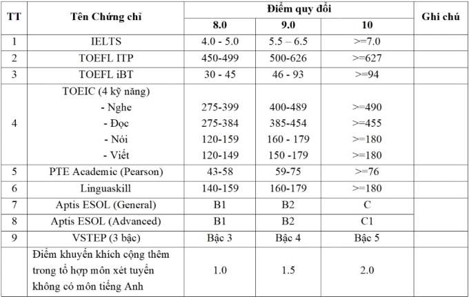 Thí sinh có chứng chỉ tiếng Anh được cộng điểm khuyến khích hoặc quy đổi như sau:
