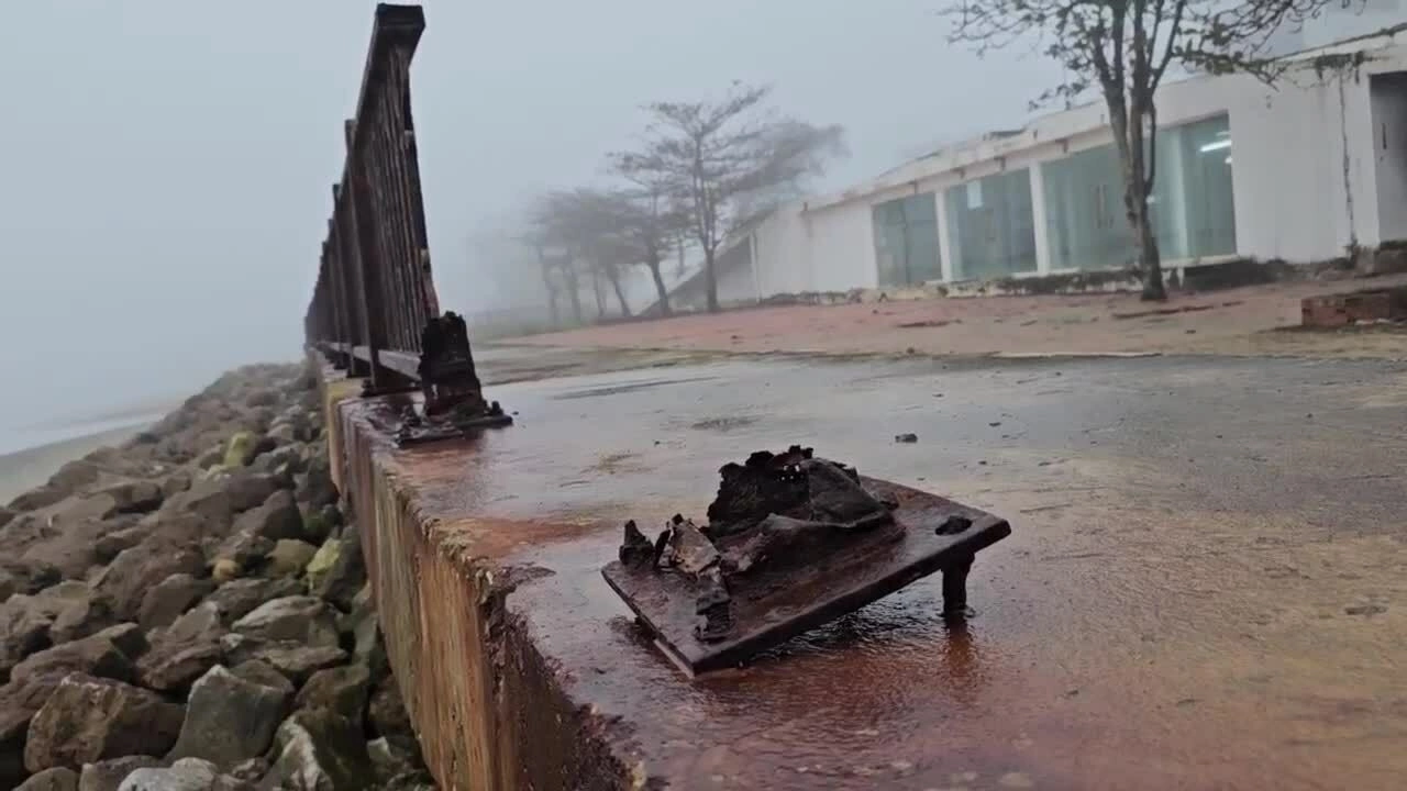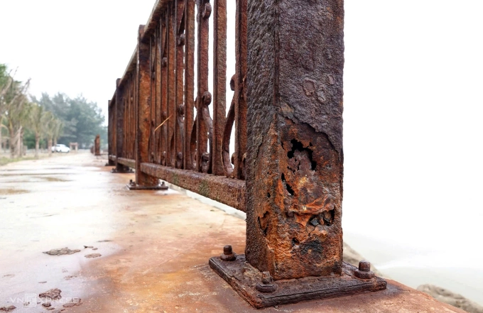 Một số trụ và phần lan can còn lại đều hoen gỉ,bề mặt thủng lỗ chỗ do bị nước biển ăn mòn. Ảnh: Lê Hoàng