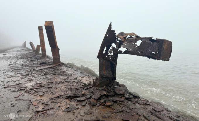 Trụ sắt gãy vụn trên bờ kè. Ảnh: Lê Hoàng