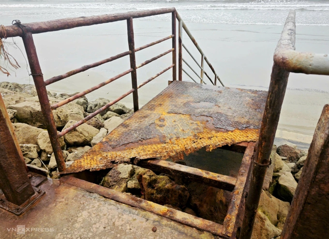 Cầu thang dẫn xuống biển mục mại,thủng nhiều mảng lớn. Ảnh: Lê Hoàng