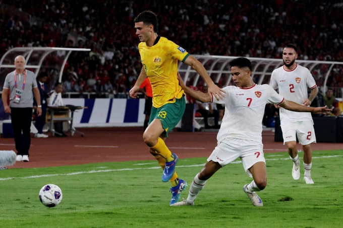 Trung vệ Alessandro Circati (áo vàng) che bóng trước tiền vệ Marselino Ferdinan trong trận Australia hòa Indonesia trên sân Bung Karno,thành phố Jakarta,Indonesia,lượt hai bảng C vòng loại ba khu vực châu Á,World Cup 2026,tối 10/9/2024. Ảnh: Reuters