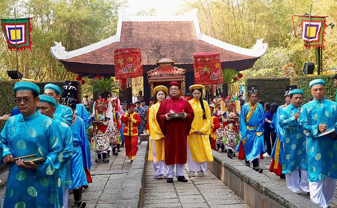 Nghi thức diễu hành đón rước lễ tại Khu tưởng niệm vua Hùng thuộc Công viên Lịch sử,Văn hóa dân tộc,sáng 7/4. Ảnh: An Phương