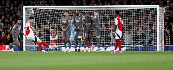 Declan Rice đá phạt mở tỷ số trong trận Arsenal thắng Real 3-0 trên sân Emirates,London,Anh ngày 8/4. Ảnh: AS