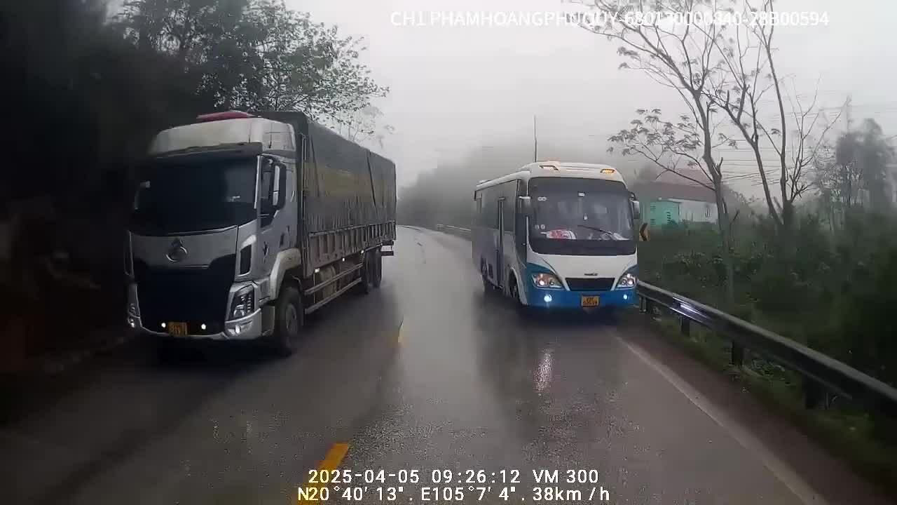 Tình huống giao thông: Trời mưa,đường trơn trượt,tầm nhìn hạn chế tại khúc cua,chiếc xe khách lấn làn vượt qua một chiếc xe tải lớn để vượt đúng lúc xe gắn camera hành trình ở hướng ngược chiều đi tới. Tài xế bắt buộc phanh gấp,lọt vào giữa hai xe ngược chiều để tránh tai nạn. May mắn không có va chạm xảy ra.