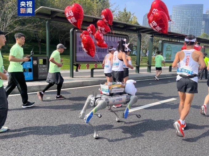 Robot bốn chân đóng vai trò pacer,phát nhạc,thông điệp động viên và mẹo an toàn cho các runner tại Hàng Châu Marathon ngày 3/11/2024. Ảnh: China Focus