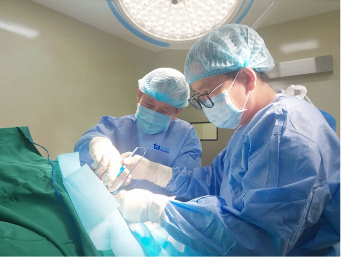 Bác sĩ Vinh phẫu thuật cắt u bã đậu cho anh Dũng. Ảnh: Phòng khám Đa khoa Tâm Anh Quận 7