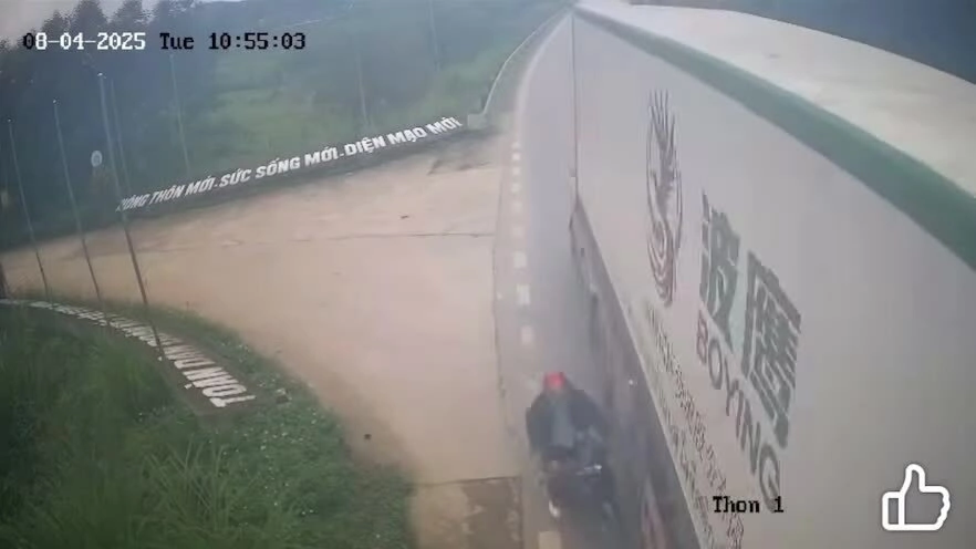 Tình huống giao thông: Không có dấu hiệu giảm tốc độ,từ đường nhánh người đàn ông điều khiển xe máy lao sát vào hông xe tải lớn để nhập làn. Va chạm xảy ra,may mắn người đi xe máy chỉ bị xây xước nhẹ.