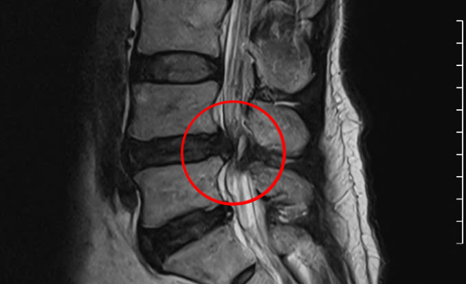 Chụp MRI cho thấy vị trí đốt sống bị trượt chèn ép dây thần kinh của người bệnh. Ảnh: Bệnh viện Đa khoa Tâm Anh