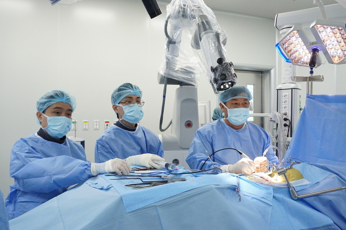 Các bác sĩ thực hiện ca mổ cho ông Tân bằng robot Modus V Synaptive. Ảnh: Bệnh viện Đa khoa Tâm Anh