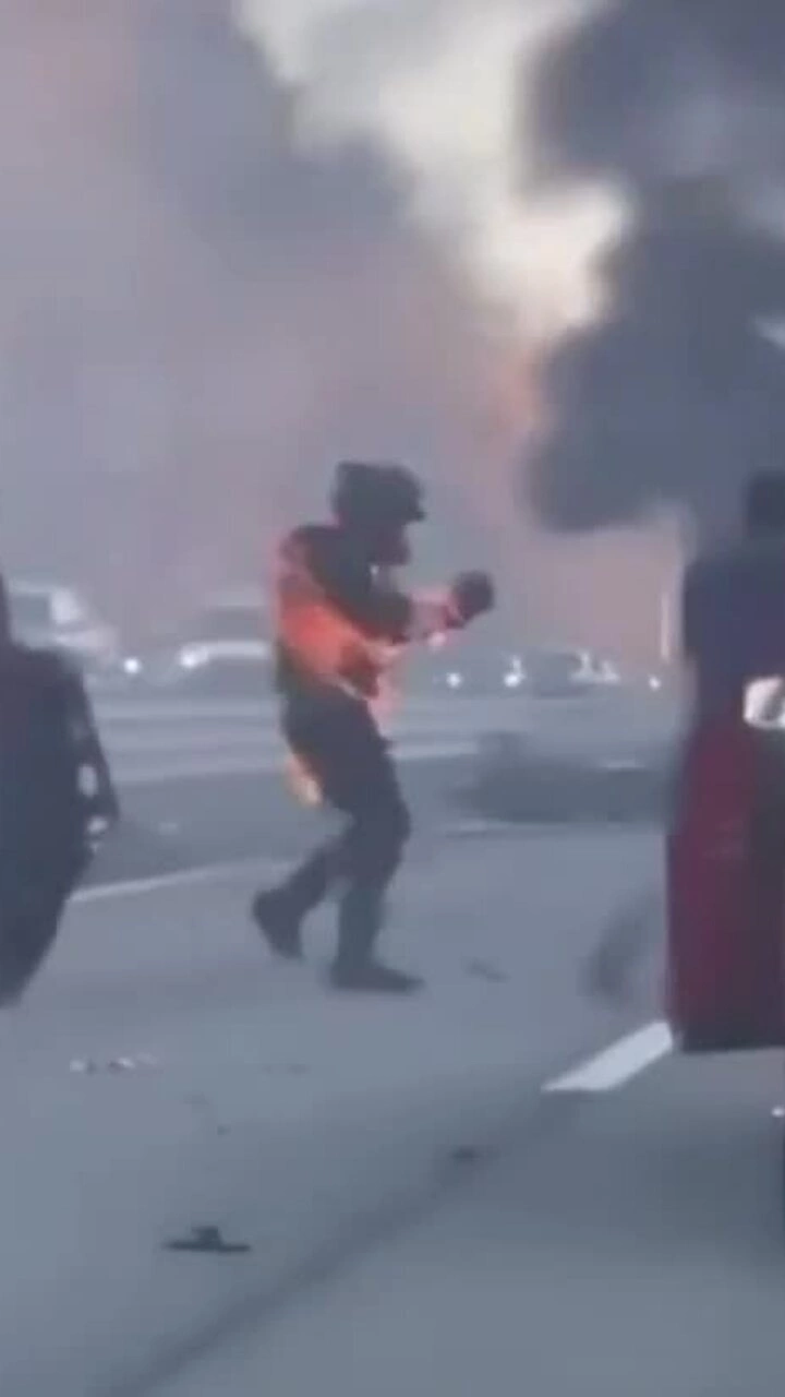 Tay lái môtô cũng tự cứu mình bằng cách nằm lăn ra đường lẫn chạy sang bãi cỏ nhưng không thể dập lửa. Một người phụ nữ định phủ chiếc chăn lên người tay lái nhưng bị trượt.