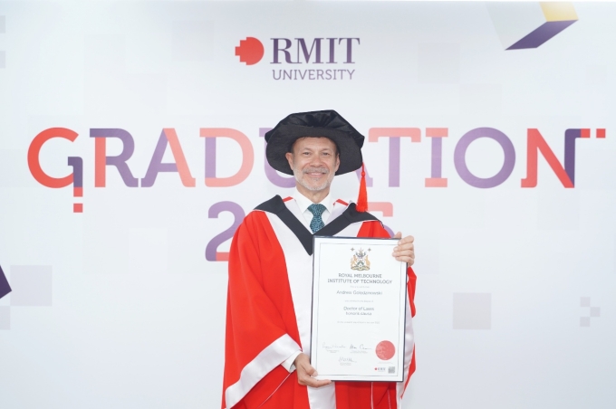 Ngài Andrew Goledzinowski,cựu Đại sứ Australia tại Việt Nam giai đoạn 2022-2024,nhận bằng Tiến sĩ Danh dự ngành Luật từ Đại học RMIT. Ảnh: RMIT
