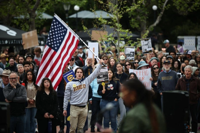 Trong khuôn viên Đại học Berkeley ở Berkeley,California,hàng trăm sinh viên,giảng viên và thành viên cộng đồng tập hợp,vẫy cờ Mỹ và mang theo các biểu ngữ như "Giáo dục mang lại lợi ích cho cộng đồng" và "Đừng động vào quyền tự do ngôn luận của chúng tôi".
