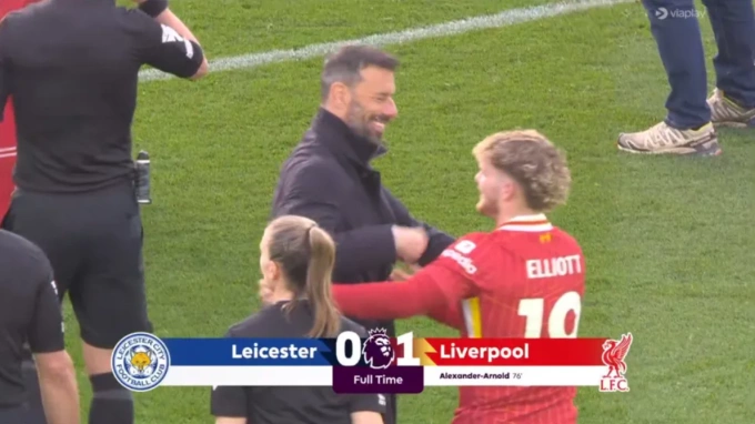 HLV Ruud Van Nistelrooy (trái) tươi cười và ôm tiền vệ Harvey Elliott sau trận Leicester thua Liverpool 0-1 ở vòng 33 Ngoại hạng Anh ngày 20/4. Ảnh chụp màn hình