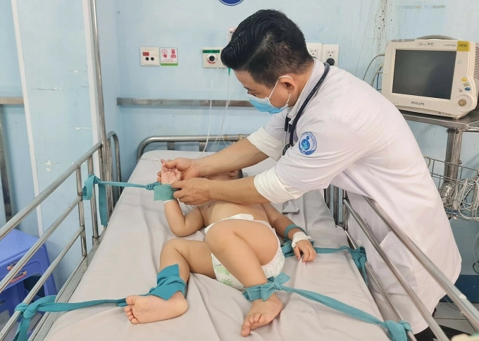 Trẻ tay chân miệng nặng điều trị tại Bệnh viện Nhi đồng 1,được cố định tay chân vào giường để tránh kích thích. Ảnh: Lê Phương