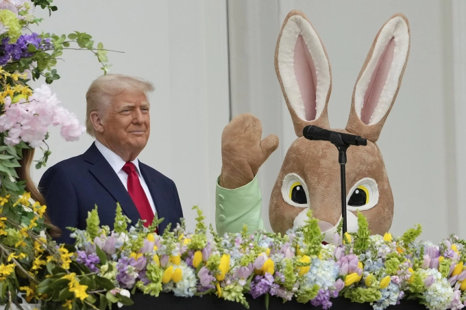 "Chúc mừng lễ Phục sinh tất cả mọi người",Tổng thống Mỹ Donald Trump phát biểu mở đầu sự kiện Lăn trứng Phục sinh khi đứng cạnh Đệ nhất Phu nhân Melania và một người hóa trang thành thỏ Phục sinh trên ban công Nhà Trắng ngày 21/4.