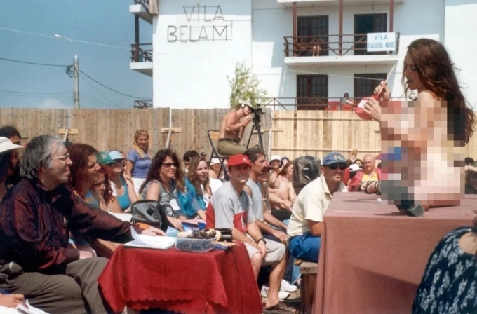 Gregorian Bivolaru (tóc hoa râm) xem biểu diễn khỏa thân trong trại yoga. Ảnh: EuroPics - CEN