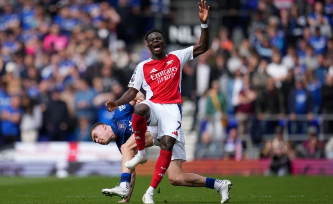 Bukayo Saka (áo đỏ) đau đớn khi bị Leif Davis phạm lỗi từ phía sau,trong trận Arsenal thắng Ipswich Town 4-0 ở vòng 33 Ngoại hạng Anh,ngày 21/4/2025 trên sân Portman Road,Suffolk,Anh. Ảnh: Shutterstock