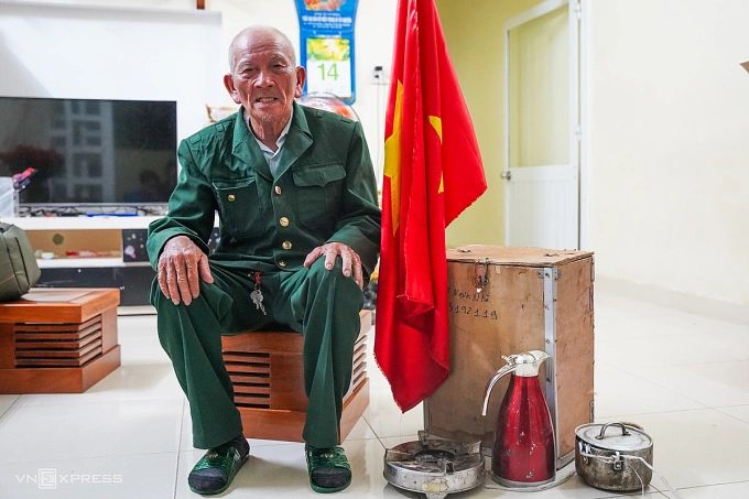 Cựu binh Trần Văn Thanh cùng tư trang trên hành trình từ TP Vinh (Nghệ An) vào TP HCM xem diễu binh dịp 30/4,Ảnh: Bùi Toàn