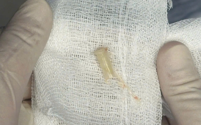 Ngày 24/4,ThS.BS.CK2 Nguyễn Thanh Tùng,Bệnh viện Tai Mũi Họng TP HCM,cho biết CT scan ghi nhận có dị vật ở phế quản gốc trái,hình ống,dài 10 mm. Các bác sĩ nội soi phế quản,gắp được dị vật chiếc kèn nhựa hình ống ra ngoài.