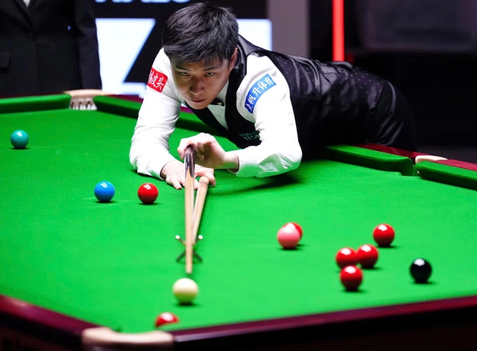 Zhao Xintong trong trận chung kết snooker thế giới gặp Mark Williams ở Nhà hát Crucible,thành phố Sheffield,Vương quốc Anh tối 5/5/2025. Ảnh: PA