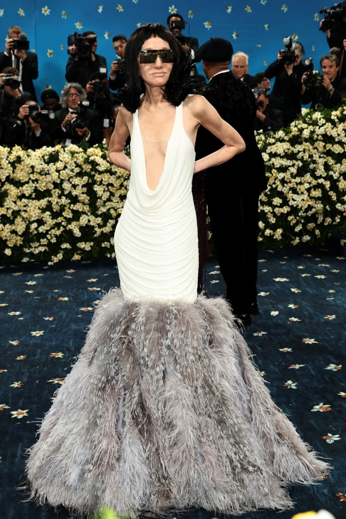 Bà bước lên bậc thang của Bảo tàng Nghệ thuật Metropolitan sáng 6/5 (giờ Hà Nội) trong bộ đầm tự thiết kế. Chiếc váy đuôi cá màu trắng được tạo điểm nhấn bằng một đường xẻ sâu từ ngực xuống eo,đính lông vũ màu xám dày đặc ở phần đuôi và điểm một ít ở cầu vai. Nhà thiết kế tạo vẻ mới lạ bằng kiểu tóc lob ngang vai với mái ngố,kính râm.
