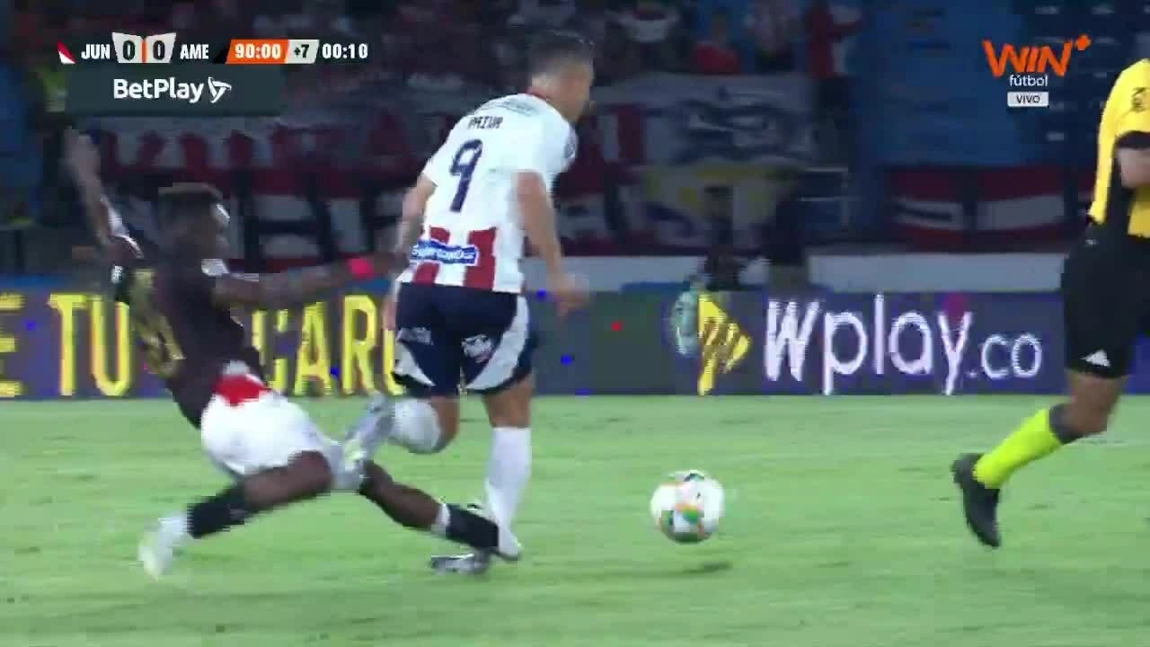 Cú vào bóng nguy hiểm của Micolta với Paiva trong trận Junior de Barranquilla hòa America de Cali trên sân Metropolitano Roberto Melendez,thành phố Barranquilla,Colombia ngày 4/5/2025.