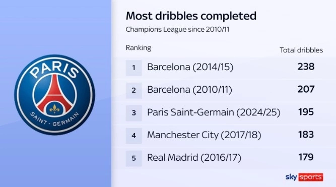 Nhưng chưa cần chức vô địch châu lục,Enrique vẫn để lại dấu ấn đậm nét tại PSG. Thống kê rõ ràng nhất cho thấy điều này là PSG có nhiều pha rê bóng nhất trong một mùa giải Champions League (195) kể từ Barca của chính Enrique cách đây một thập kỷ (238).